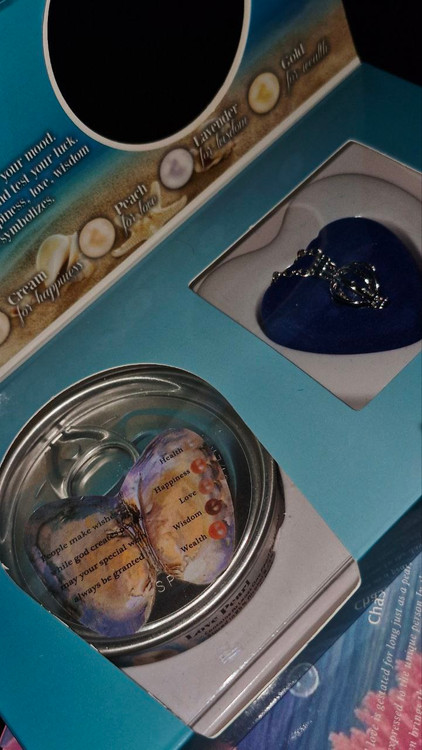 پک مروارید عشق شامل گردنبند و کنسرو صدفه که داخل صدف یدونه مرواریده رنگ مرواریدا مشخص نیست و رندومه و هر رنگ نماد یک چیزه